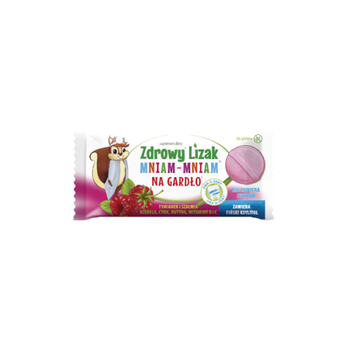 Lizak Mniam Mniam to lizak wolny od cukru i substancji konserwujących. Zawiera naturalne aromaty i barwniki, suszone owoce malin, wyciągi roślinne z tymianku, szałwii oraz aceroli a także cynk, rutynę i witaminę D. Jako substancja słodząca użyte zostały substancje pochodzenia roślinnego : ksylitol - cukier brzozowy, izomalt - pozyskiwany z buraków oraz glikozydy stewiolowe pozyskiwane ze stewii. Polecany dla dorosłych i dzieci powyżej 3 roku życia.